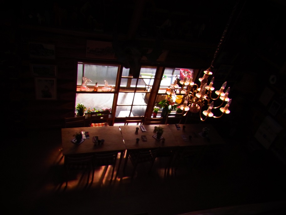 吹き抜けの食堂を二階客室前から。