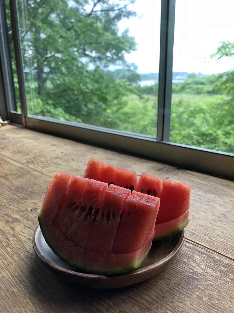 ツリーハウスは見晴らしが良く、山々と電車を眺めながら、または木々の揺れる音や鳥や虫の鳴き声を聞きながら、コーヒー休憩です。この日はスイカも頂きました。私にとって今年の初スイカで瑞々しく美味しかったです。
